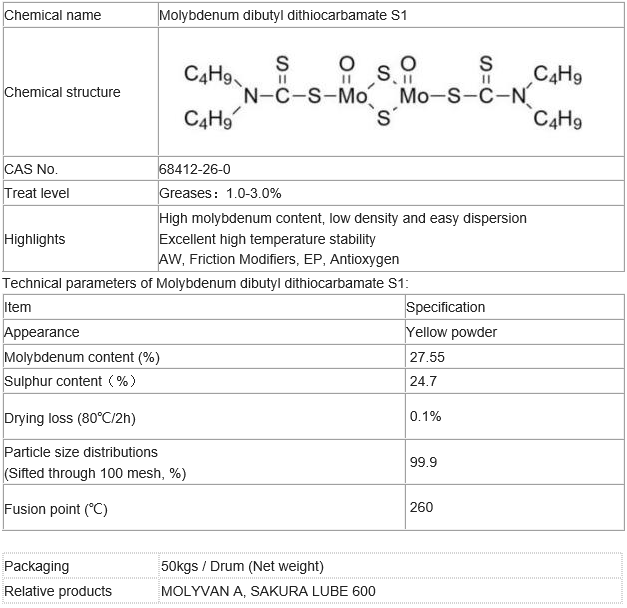 MoDTC-S1 is a solid organic molybdenum extreme pressure anti-wear agent, it is also called Powder type MoDTC, which guarantees excellent antioxidant and anti-wear properties of greases under high temperature and long life conditions. In grease, its antioxidant and anti-wear properties are far better than inorganic molybdenum additives, and can completely or partially replace molybdenum disulfide. The product is weakly alkaline, but does not lead to rust, low density, easy dispersion, and can also be used in other non-petroleum based lubricants.